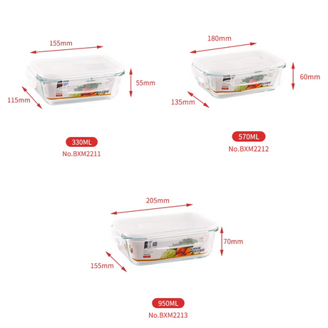 Borosilicate Glass Containers With Lid Sealed 3 pieces Rectangle (330ml,570ml,950ml)